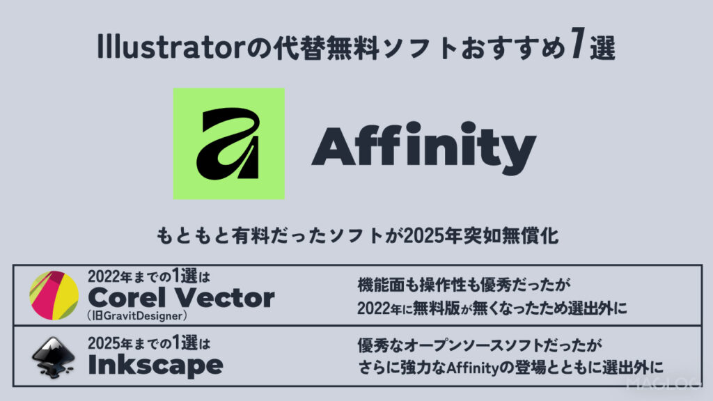 Illustratorの代替となる無料ソフトとして、2025年まで勧めていたのは『Inkscape』でした。しかし、Affinityが完全無料として再ローンチされてから状況が一変。